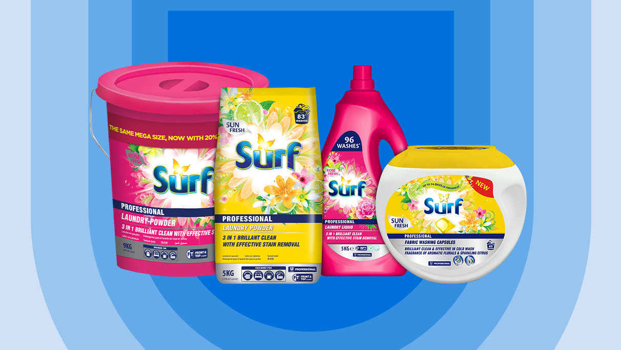 Born in the heart of homes around the world, Surf has long been trusted by families for its vibrant fragrances and powerful cleaning performance. With every wash, Surf brought joy, freshness, and a burst of confidence to everyday laundry.Building on this legacy, Surf expanded into the professional space—bringing the same trusted quality to businesses. Today, Surf Professional supports hotels, restaurants, and care facilities with high-performance cleaning solutions that deliver long-lasting fragrance and impeccable cleanliness, helping businesses create memorable guest experiences through the power of scent and care.